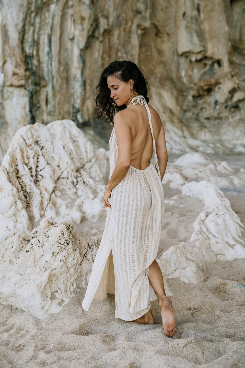 Crafted from 100% organic cotton, this lightweight summer dress feels soft against the skin while allowing natural airflow on warm days. The halter neckline beautifully frames the shoulders, while the open back adds a refined, feminine touch. Its relaxed, flowy silhouette creates graceful movement, making it perfect for beach vacations, summer events, resort wear, or everyday elevated dressing.